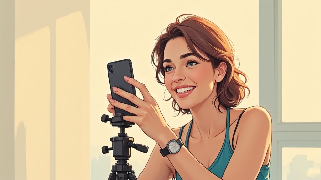 Als Erstes richtest du dein kleines „Heimstudio“ ein. Stell dich seitlich zu einem Fenster. Das weiche, natürliche Licht von der Seite ist pures Gold, weil es dein Gesicht schmeichelhaft modelliert und harte Schatten vermeidet. Dein Smartphone platzierst du direkt gegenüber von dir, idealerweise auf Augenhöhe. Ein stabiler Stand ist hier wirklich das A und O, um verwackelte Bilder zu verhindern.