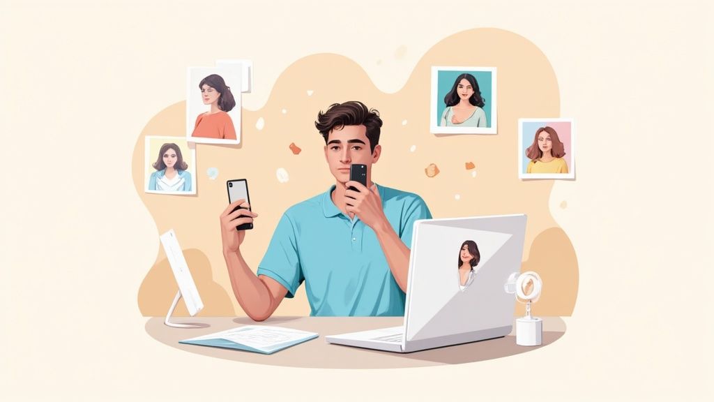 Der wichtigste Faktor für ein gutes Foto ist das Licht. Weiches, indirektes Tageslicht ist hier dein allerbester Freund. Es leuchtet dein Gesicht gleichmäßig aus, verhindert harte Schatten und lässt dich sofort frisch und wach aussehen. Der einfachste Weg dorthin? Stell dich direkt vor ein Fenster, sodass das Licht frontal auf dein Gesicht fällt.