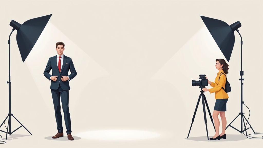 Okay, die Vorbereitung steht, das Outfit liegt bereit – jetzt wird’s ernst. Die Entscheidung, wer dein Foto macht und wo es aufgenommen wird, ist absolut entscheidend für das Ergebnis. Im Grunde hast du drei Möglichkeiten: der Gang zum professionellen Fotografen, der schnelle Automat am Bahnhof oder der Do-it-yourself-Versuch mit dem Smartphone.