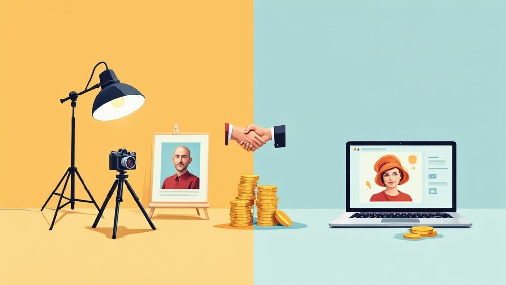 Der erste logische Schritt ist, Angebote genau unter die Lupe zu nehmen. Viele Fotostudios locken mit Paketpreisen, die neben dem Shooting selbst auch eine feste Anzahl an bearbeiteten Digitalfotos enthalten. Schau hier aber genau hin, was wirklich inklusive ist, damit du später nicht von Zusatzkosten für weitere Bilder oder eine intensivere Retusche überrascht wirst.