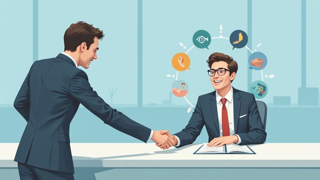 Dein Gesicht ist die ausdrucksstärkste Leinwand deiner Persönlichkeit. Eine offene, freundliche Mimik ist ein entscheidender Faktor für die Körpersprache im Bewerbungsgespräch. Ein authentisches Lächeln baut sofort eine Verbindung auf, signalisiert Sympathie und emotionale Intelligenz. Es geht nicht darum, ununterbrochen zu grinsen, sondern deine Gesichtsausdrücke passend zur Gesprächssituation einzusetzen und so Offenheit und Zugänglichkeit zu vermitteln.