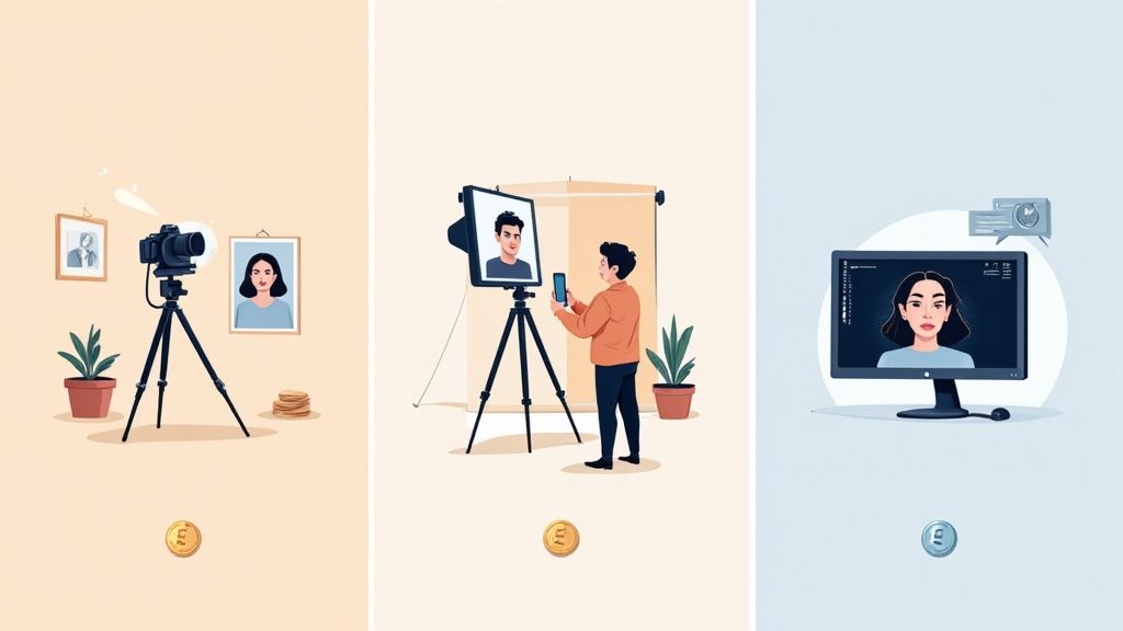 Du kennst jetzt die drei gängigsten Optionen: den Gang zum Profi-Fotografen, die budgetfreundliche DIY-Methode und den schnellen Weg über KI-Tools. Doch welche Lösung ist die richtige für dich? Die Antwort hängt von deiner Branche, deiner angestrebten Position und deinem Budget ab.