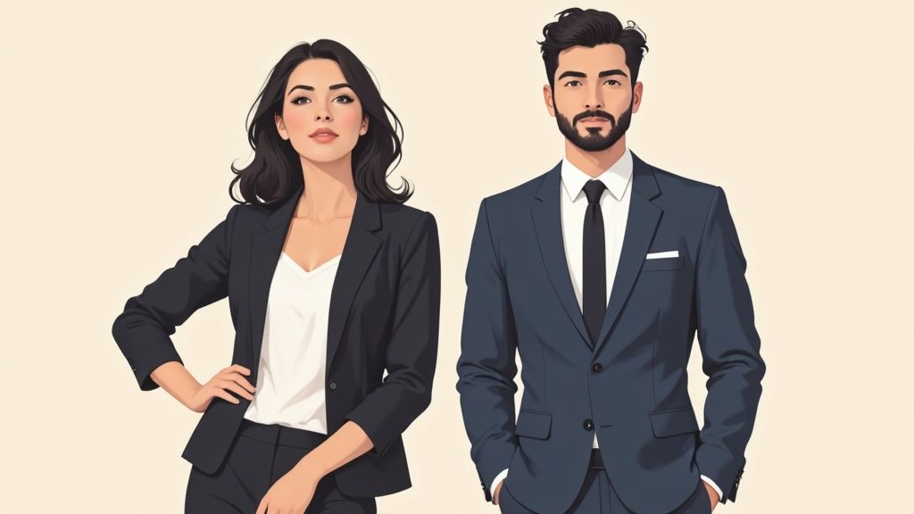 Bevor wir tief in branchenspezifische Dresscodes eintauchen, müssen wir über das Fundament sprechen. Es gibt ein paar universelle Regeln, die über Top oder Flop entscheiden, egal wo du dich bewirbst. Ein professionelles Outfit steht auf drei simplen, aber absolut entscheidenden Säulen: eine super Passform, gute Stoffe und ein tadelloser Zustand.