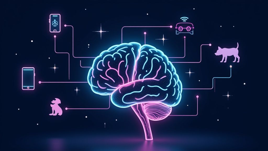Du fragst dich: Wie funktioniert künstliche Intelligenz, einfach erklärt? Stell dir KI als eine extrem lernfähige Software vor. Sie analysiert riesige Datenmengen, erkennt darin Muster und ahmt so menschliche Denkprozesse nach, um eigenständig Probleme zu lösen, Entscheidungen zu treffen oder sogar neue Inhalte zu erstellen.